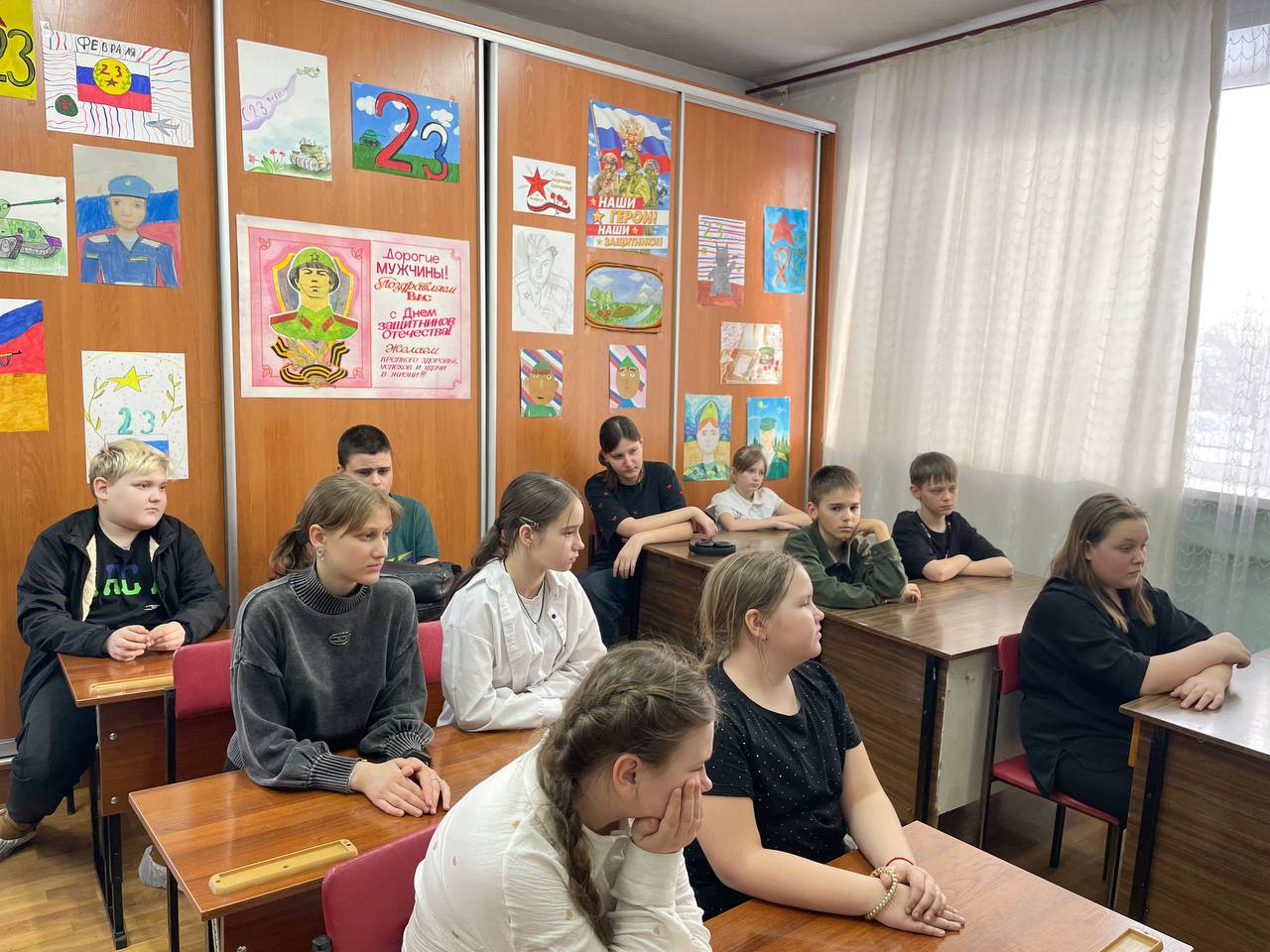 Посвящённый 80-летию Великой Победы. Учащиеся с вниманием слушали рассказы о героях Великой Отечественной войны: о лётчиках, которые сражались в небе, о солдатах, шедших в атаку с песней на устах, и о тружениках тыла, ковавших Победу, провела урок преподаватель Политова Ольга Николаевна.