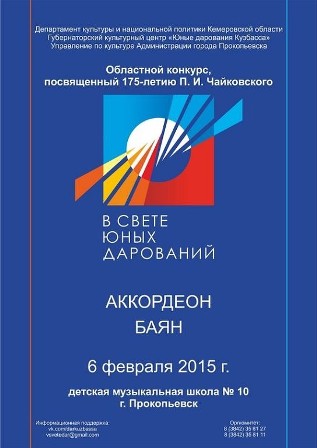 6 февраля 2015 года в ДМШ №10 состоялся областной конкурс юных музыкантов "В свете юных дарований",посвященный 175-летию П.И.Чайковского. Номинация Аккордеон, баян нашу школу представлял Зорниченко Григорий 2 класс,преподаватель Шайдулин Михаил Шамильевич.Получена грамота за участие.Поздравляем и желаем новых творческих побед!