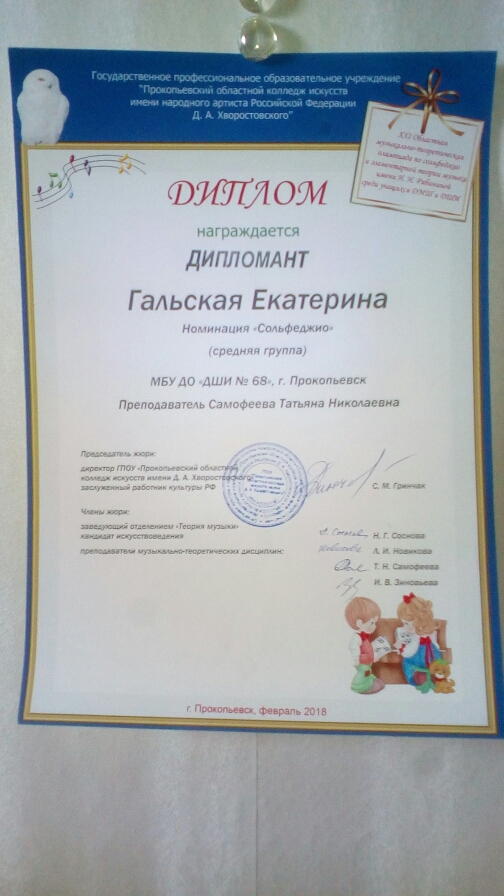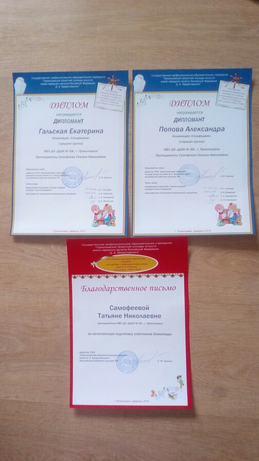 Нашу школу искусств представляли 5 участников. Гальская Екатерина и Попова Александра стали Дипломантами IV степени - подготовила дипломантов Самофеева Татьяна Николаевна. Филимонова Варвара, Дмитриева Алена и Волос Анатолий получили дипломы участникой областной олимпиады. Подготовили участников Сальцина Галина Васильевна и Политова Ольга Николаевна.