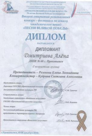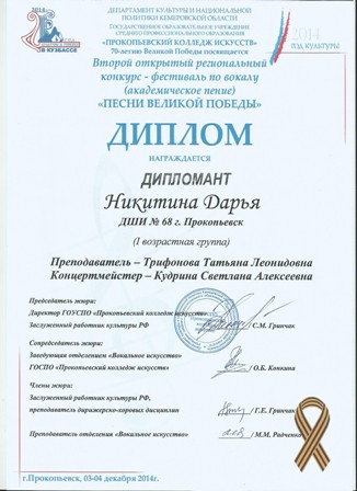 3 декабря 2014 года в концертном зале "Прокопьевского колледжа искусств" прошел Второй открытый региональный конкурс - фестиваль по вокалу (академическое пение) "Песни Великой Победы" 70-летию Великой Победы посвящается. Нашу школу на этом конкурсе представляли две участницы Дмитриева Алена, преподаватель - Резенова Елена Леонидовна, концертмейстер Кудрина Светлана Алексеевна и Никитина Дарья, преподаватель- Трифонова Татьяна Ленонидовна ,концертмейстер Кудрина Светлана Алексеевна. Обе участницы - стали дипломантами конкурса.Поздравляем участниц,преподавателей.концертмейстера и желаем новых побед и вдохновения!