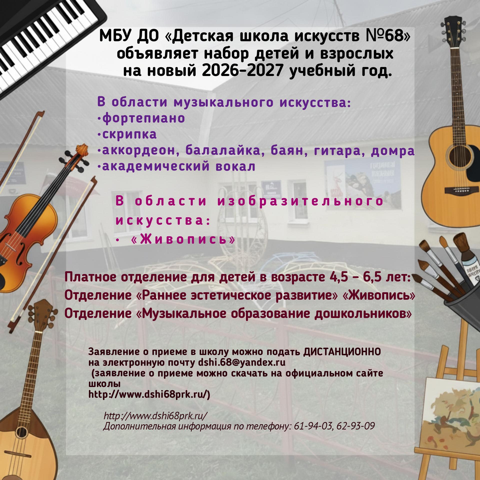 Возможна подача документов в отсканированном виде (pdf-файл) по электронной почте dshi.68@yandex.ru
