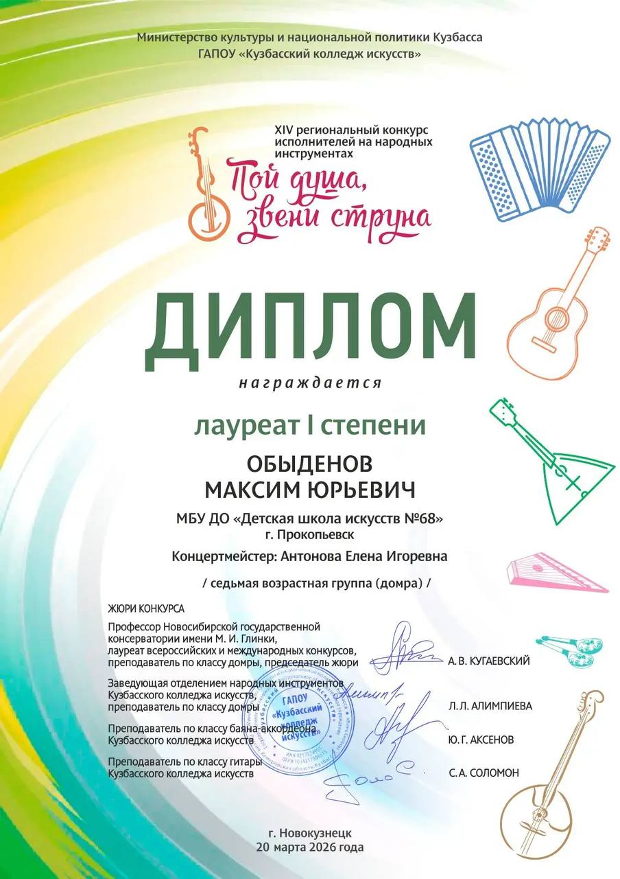 Обыденов Максим Юрьевич - лауреат 1 степени, концертмейстер Антонова Елена Игоревна.